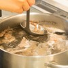 水を入れたボウルを用意し、おたまでアクをすくいます。一度アクをとったら、ボウルの中の水でしっかり洗い落としてから次をすくうよ...