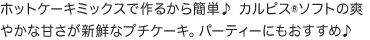 子どもから大人まで長年親しまれているカルピス®を、新しいおいしさに! 使いやすいやわらかなファットスプレッドだから、パンにぬって楽しめるのはもちろん、パンケーキやカップケーキなどのお菓子作り・パン作りにも使えます。